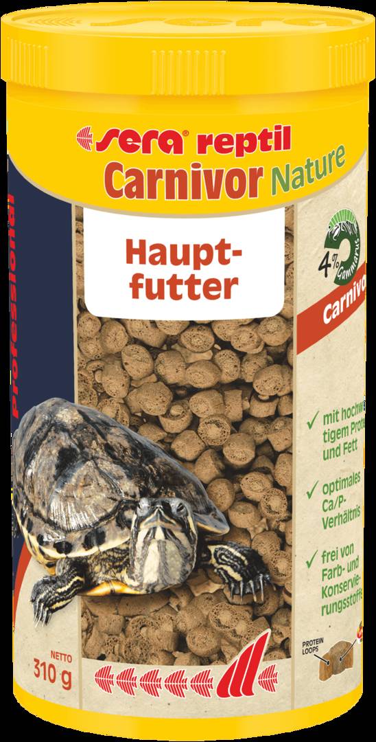 Sera Reptil Professional Carnivor-Храна за костенурки и други месоядни влечуги 250 мл. Професиона ко-екструдирана храна за месоядни влечуги! Чрез този начин на производство чувствителните витамини и жизнени съставки се обработват отделно от протеините с щадящ нискотемпературен процес. Храната се състои от два слоя - външен кръг с висококачествени протеини и мазнини и сърцевина с необходимите витамини и минерали, както и морски водорасли за повишаване устойчивоста на болести. Оптималното съотношение калций/фосфор води до здравословен растеж и здрави кости и черупка. Предлага се в разфасовки от 100, 250 и 1 000 мл. Съдържание: риба, царевично нишесте, гамарус, ракообразни, миди, морски водорасли, рибно масло, витамини, оцветител. Добавени: Вит.А 38.000 IU/кг., Vit.D3 2.000 IU/кг, Vit.E 120 мг/lb., Vit.C 550мг/кг. Гарантиран Анализ: Суров протеин 38 %, сурови мазнини 8 %, сурови влакнини 5 %, влага 5.5 %, сурова пепел 8 %, макс.калций 2 %, мин.фосфор 1 %. Произведено в Германия от sera GmbH, Heinsberg.