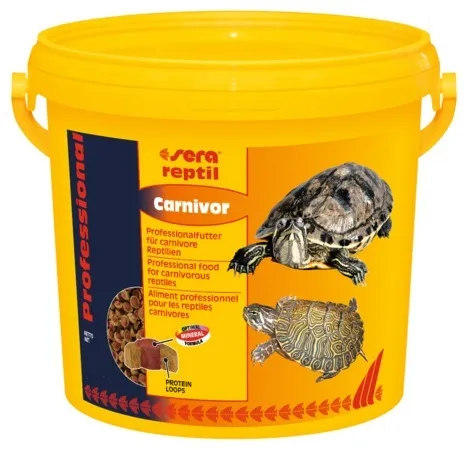 Sera Reptil Professional Carnivor-Храна за костенурки и други месоядни влечуги 1000 мл. Професиона ко-екструдирана храна за месоядни влечуги! Чрез този начин на производство чувствителните витамини и жизнени съставки се обработват отделно от протеините с щадящ нискотемпературен процес. Храната се състои от два слоя - външен кръг с висококачествени протеини и мазнини и сърцевина с необходимите витамини и минерали, както и морски водорасли за повишаване устойчивоста на болести. Оптималното съотношение калций/фосфор води до здравословен растеж и здрави кости и черупка. Предлага се в разфасовки от 100, 250 и 1 000 мл. Съдържание: риба, царевично нишесте, гамарус, ракообразни, миди, морски водорасли, рибно масло, витамини, оцветител. Добавени: Вит.А 38.000 IU/кг., Vit.D3 2.000 IU/кг, Vit.E 120 мг/lb., Vit.C 550мг/кг. Гарантиран Анализ: Суров протеин 38 %, сурови мазнини 8 %, сурови влакнини 5 %, влага 5.5 %, сурова пепел 8 %, макс.калций 2 %, мин.фосфор 1 %. Произведено в Германия от sera GmbH, Heinsberg.