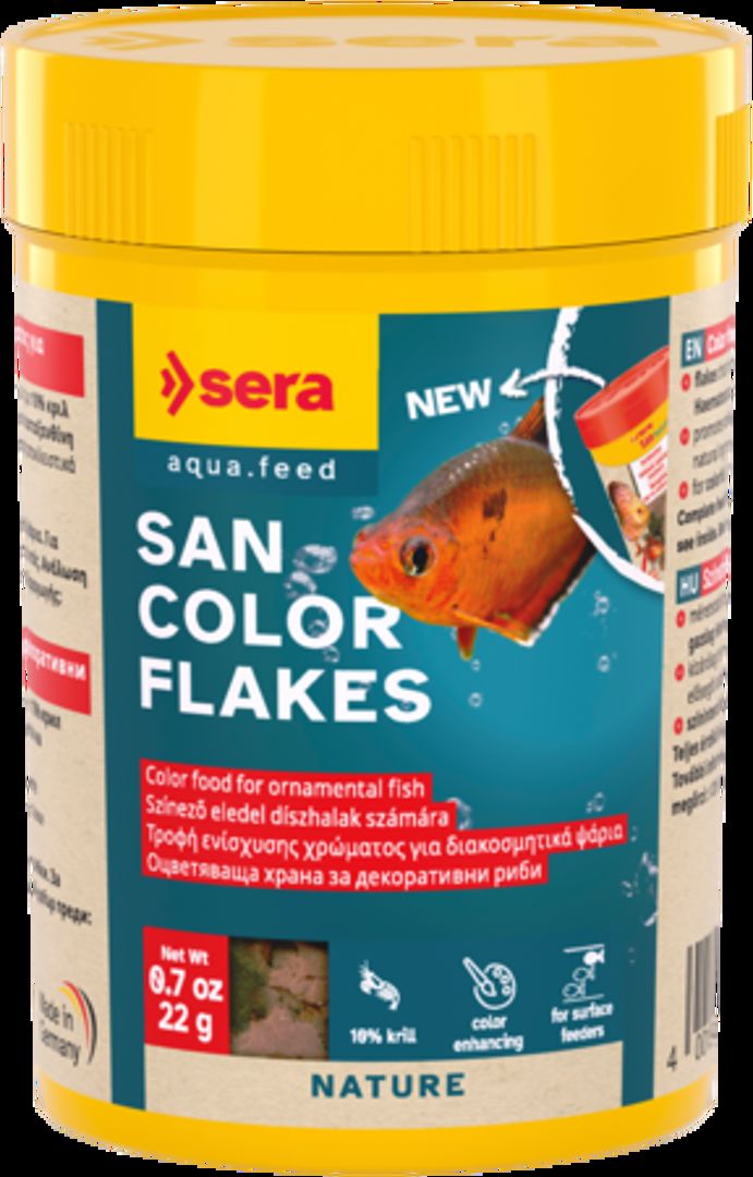 Sera San Nature - Основна оцветяваща храна без оцветители и консерванти, 100 мл Sera Nature прави още по-естествено храненето на декоративните риби. Всички видове храни от серията (например Sera San Nature) се основават на съставите от техните съименници (например San), но се произвеждат без използване на оцветители и консерванти. Цветът на люспите произхожда изключително от добавени натурални съставки като водораслите Haematococcus и крил.