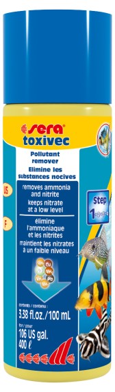 При случаи на високи нива на амоний/амоняк, нитрити, хлор, тежки метали имате нужда от препарата Sera Toxivec. Можете да го използвате още при смяна на водата, както и при чистене на филтъра. Премахва остатъците от някои лекарства (метиленово синьо, малахитово зелено) и след третиране на водата със Sera Algovec. Предлага се в разфасовки от 50, 100, 250, 2 500 и 5 000 мл.