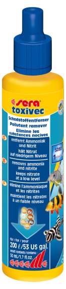 Със Sera Toxivec Sera ви предлага отстранител на замърсяванията, както и балансиране на нивата на нитрити и амоняк за около 60-90 минути. Всяка нормална доза понижава нивата на амоняк и нитрати средно с 30-50%, като максимумът, който може да се премахне с една доза, е 1.3 mg/l амоняк или 0.75 mg/l нитрити (= 0.23 мг/л NO2 – N). В случай на по-високи замърсявания се препоръчва да се увеличи дозата съгласно инструкцията за употреба или да се дозира отново след 1-2 часа. Така Sera Toxivec ви позволява да напълните аквариума с риби по-бързо. Съшо в случаи на формиране на замърсявания той моментално и ефикасно предпазва рибите от това да бъдат увредени, докато не се образува стабилна бактериална среда. Допълнително Sera Toxivec предотвратява образуването на високи нитратни нива, като амонякът и нитритите директно се обезвреждат и не образуват повече нитрати.