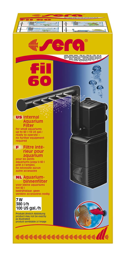 Sera - Вътрешен филтър sera fil 60 за акв. до 60 л. Добре поддържан аквариум с растения и красиви рибки е възможен и в по малки по обем аквариуми. В тази връзка sera fil 60 / 120 е идеален за малки аквариуми. Големият филтърен обем (съответно 200/350см2) гарантира оптимална филтрация, възможно най доброто биологично разграждане на отпадъците и осигурява кристално чиста и биологически стабилна вода. Пречистване на водата в няколко стъпки: 1. Механично: едрите отпадъци механично се филтрират от филтърната гъба в първото отделение. 2. Химично: активният въглен sera super carbon в другото оделение премахва токсичните органични замърсявания, както и пестицидите, и лекарствата. 3. Третото отделение на филтъра включено в sera fil 120 съдържа sera siporax mini®. В тази част се извършва биологичното пречистване. sera siporax mini® има голяма площ за развитие на полезните пречистващи бактерии. Тази трета част може допълнително да се добави и на sera fil 60. 4. Третото отделение увеличава полезният филтърен обем и повишава капацитета на филтъра. Възможност за отделно закупуване и добавяне на модул, гъба, sera siporax mini® и sera super carbon. Енергоспедстващи, изразходват съответно 7 / 10 W. Тихи и лесени за почистване и поддръжка. Включени са и комплект от части за различна инсталация в аквариума ( спрейбар, Г – образни свръзки, вакумчета, възможност за вкарване на въздух ). Може да се инсталира и в аквариум с водни костенурки. Технически данни: 230V - 50Hz, 7 W, 380 l/h, H 0.9 m Важно: Само за сладководен аквариум. Да не работи дълго време извън водата. Препоръки за максимална ефективност: За максимална ефективност биологичните филтри трябва да работят постоянно, като се изключват за макс. 30 мин за почистване и поддръжка на аквариума. Да не се дезинфекцирват или почистват с препарати. Гъбата и sera siporax mini® да се изплакват само в аквариумна вода. Ние препоръчваме добавянето на биостартерите ( препарати съдържащи почистващи бактерии и ензими ) sera nitrivec и sera filter biostart при всяко почистване на филтъра. Първият месец след стартиране на филтъра проверявайте нивата на нитритите два пъти седмично със sera NO2 test ( тест за нитрати ), както и след всяко почистване на филтъра. Честото замърсяване на филтъра е сигнал за прекалено много рибки за този обем аквариум или прехранване. При нормално количество на рибките почиствайте филтъра на всеки 3-4 месеца. Регулярно проверявайте за запушване на филтъра от листа на растения и отпадъци