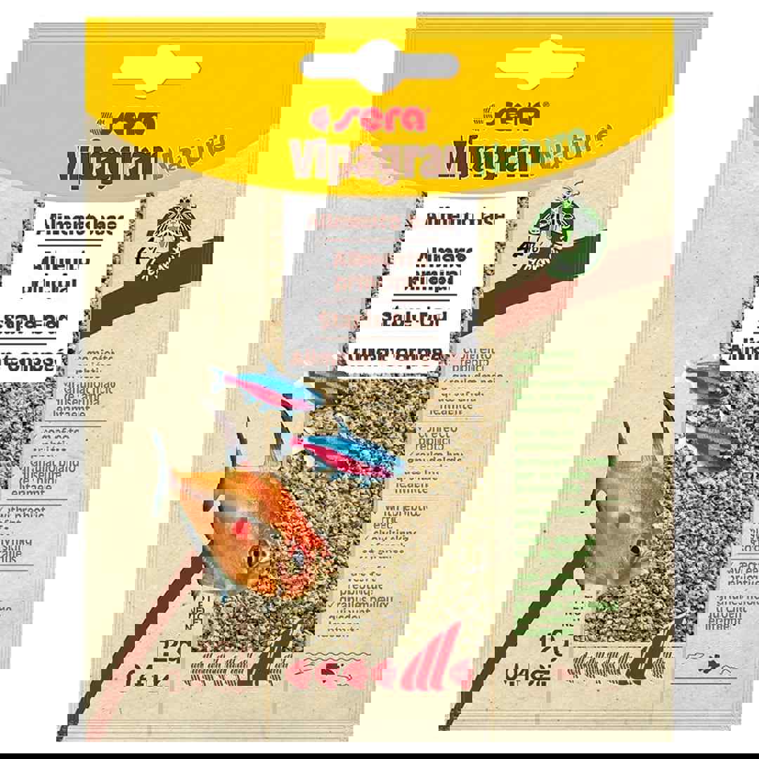 Sera Granured Nature - Храна за цихлиди 1000 мл. Sera Granured Nature е храна за цихлиди, например от езерата Малави или Танганайка, които се хранят предимно с безгръбначни. Предлага се в разфасовки от 20 гр. и 250, 1 000 мл. Високоенергийна храна за цихлиди. Инструкция за употреба: Хранете по няколко пъти на ден, но по толкова, колкото рибите могат да изядат за кратко време. Съдържание:рибно брашно, пшенично брашно, гамарус, бирена мая, планктон, хлебни продукти, Спирулина. Анализ:влага 6.7%, протеин 40.3%, мазнини 6.1%, влакнини 2.2%, пепел 9.9%.