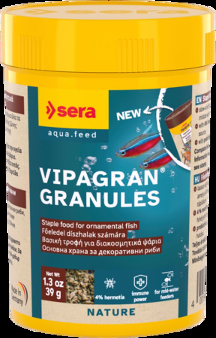 Sera Vipagran Nature - Универсална храна,подходяща е за рибки от средните водни слоеве 100 мл. Първокласна гранулирана храна, произведена от подбрани и внимателно обработени съставки. Подходяща е за рибки от средните водни слоеве като тетри, дребни видове цихлиди, барбуси и др. Предлага се в опаковки от 12 гр и 100, 250, 1 000 и 10 000 мл. Съдържа всички важни витамини и микроелементи. Стабилизираният витамин С увеличава устойчивостта срещу болести и укрепва имунната система. Добавени витамини за кг: Vit.А 38.000 IU, Vit.D3 2.000 IU, Vit. E 130mg, Vit.B1 30 mg, Vit.B2 90 mg, stab.Vit.C, 550 mg. Качествен анализ: суров протеин 41.3 %, сурови мазнини 8.7 %, сурови влакнини 2.2 %, сурова пепел 6.9 %.