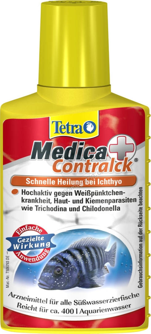 Ефективен медицински продукт за лечение на бели петна и други дерматологични заболявания на декоративните рибки, например Costia и Chilodonella. Високо ефективна комбинация от активни вещества за борба с Ichthyophthirius multifillis (белите петна по рибките) и други дерматологични болести, като Costia, Chilodonella, Trichodina и Oodinium при сладководните. Препаратът е напълно безопасен за аквариумните растения и филтърните бактерии, ако се използва правилно. Дозировка: - за профилактика и при по-лека форма на заболяването 1,5 ml на 20 литра аквариумна вода - ако клиничната картина е сериозна - 1,5 ml на 10 литра аквариумна вода Дозировка при карантина на аквариума: - нормална дозировка 1,5 ml на 20 литра аквариумна вода - при чувствителни рибки (неон) - 1,5 ml на 40 литра аквариумна вода Ако след петдневно прилагане на лечението не настъпи подобрение, филтрирайте водата 24 часа с активен въглен и повторете лечението. Курсът на лечение може да продължи до 2-3 обработки. Препоръчва се лечението на болните рибки да се провежда в общия аквариум, за да се предотврати заболяването на незаразените. Препаратът TetraMedica Contralck съдържа високоефективни вещества, които се борят с кожните паразити ефективно и безопасно; активните му съставки надеждно дезифекцират аквариумната вода. Ако се използва правилно, препаратът не уврежда аквариумните растения и не унищожава полезната микрофлора. След като лечението приключи, активните съставки се извеждат от аквариума с помощта на филтъра. Не е необходимо да се сменя водата. Внимание: ако препаратът попадне върху дрехите ви или върху мебелите, могат да останат неизмиваеми петна.