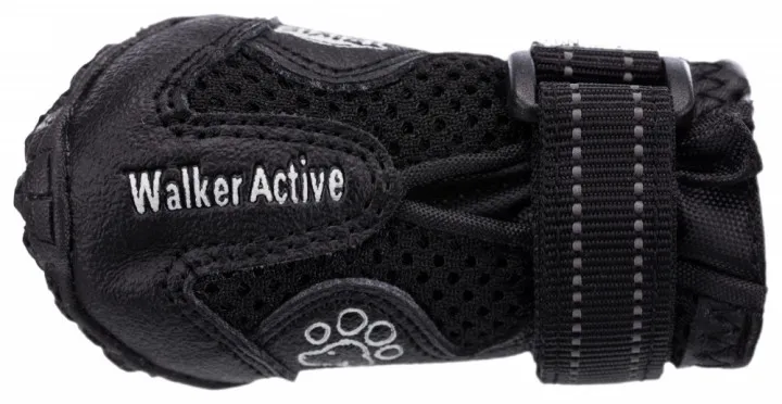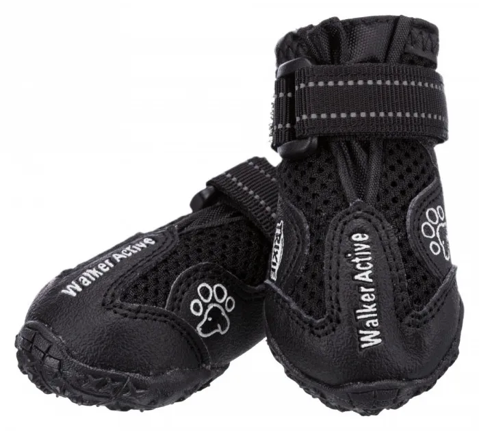 Trixie Walker Active Protective Boots XS/ S - Предпазни обувки за кучета от малки породи Здрава подметка на подложката осигурява неплъзгащо задържане (PVC) дишащ мрежест материал удобни за носене дълготраен специална защита на камениста или гореща земя предпазват от сол и песъчинки през зимата с отразяващи ивици с закопчалка за закачалки с две закопчалки за куки и примки цвят: черен