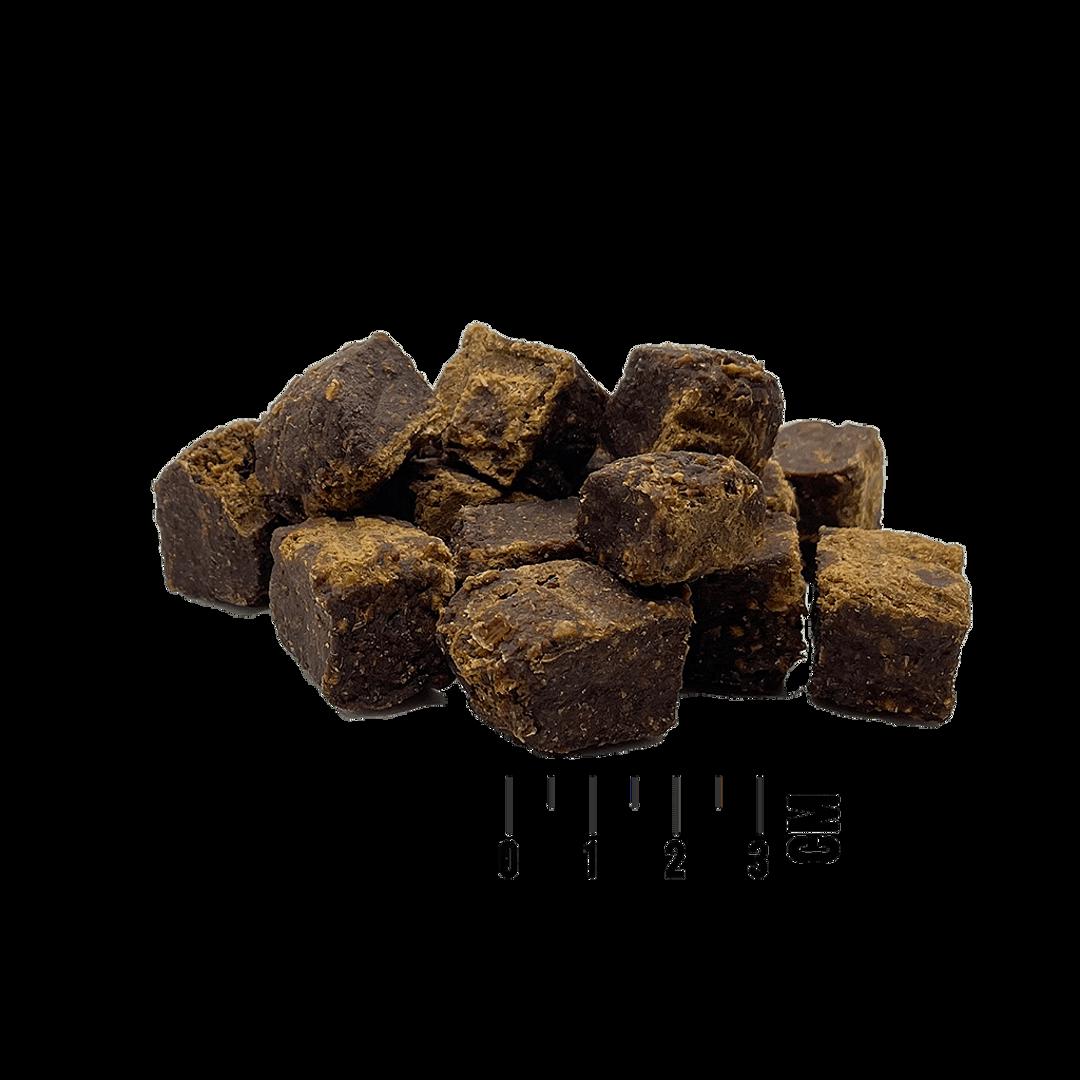 Tundra Snack Active and Vital - Премиум лакомство за активни и жизнени кучета, без зърно, снакс с месо от патешко, сьомга и дивеч. TUNDRA Снаксове ENTE, LACHS & WILD е комбинация от три тъмни меса и особено вкусни за вашия домашен любимец. 83% месо в комбинация с плодове и зеленчуци. Формулата без зърно е богата на аминокиселини и естествени антиоксиданти и поддържа жизнеността на вашето куче! Състав: патешко месо 65%, сьомга 9%, еленов протеин (изсушен) 9%, сладки картофи, моркови, грах, магнезиев пропионат, ябълкови кюспе, спирулина, арония, боровинки, магданоз, Технологични добавки: антиоксидант Препоръка за хранене: Максимум 10% от препоръчителната дневна доза храна. 100 гр.